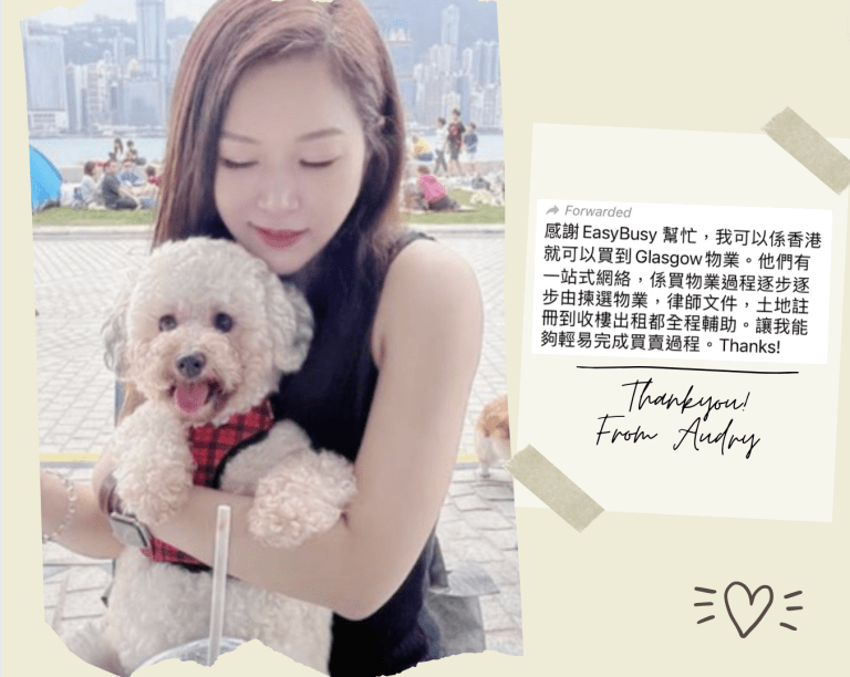 感謝EASYBUSY幫忙,我可以係香港就可以買到GLASGOW物業。他們有一站式網絡,係買物業過程逐步由揀選物業、律師文件、土地註冊到收樓出租全程輔助。讓我能夠輕易完成買賣過程。Thanks!