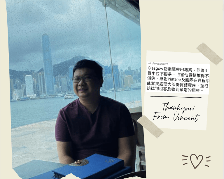 Glasgow物業租金回報高,但隔山買牛並不容易,也害怕買錯樓得不償失。感謝Natalie及團隊在過程中能幫我處理大部份買樓程序,並很快找到租客及收到預期的租金。
